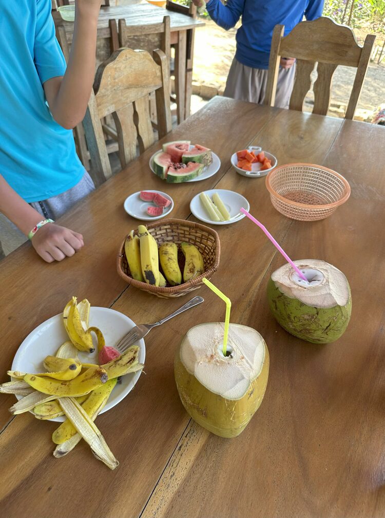 La visite s’est poursuivie dans une petite ferme familiale, où nous avons été accueillis à bras ouverts. Poules, cochons, chats, chiens… tout ce petit monde évoluait librement entre les visiteurs, au grand plaisir des enfants — quoique les plus frileux aux animaux pourraient trouver l’ambiance un peu rustique. On nous a offert des fruits frais cueillis sur place : des bananes de variétés différentes, des mangues, des fruits au goût si authentique qu’on s’est sincèrement demandé pourquoi cette qualité ne se retrouvait pas dans les buffets de l’hôtel. Cette halte, en apparence simple, nous a reconnectés à quelque chose de vrai.
